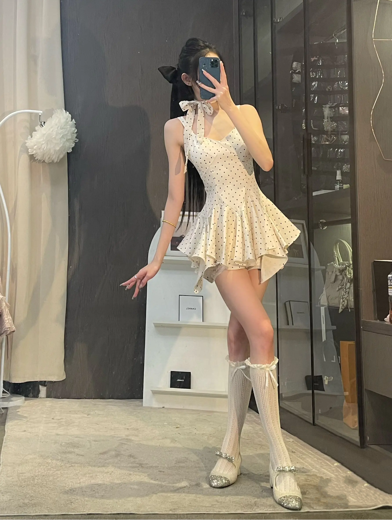 Flirty, floaty, and irresistibly feminine. The Dainty Dot Halter Dress is a vintage-inspired dream, featuring a flared peplum-style hem, a sweetheart neckline, and a delicate bow-tie halter strap that adds charm and structure. The soft polka dot print gives it a sweet, retro twist — perfect for date nights, springtime strolls, or a café moment with your girls.